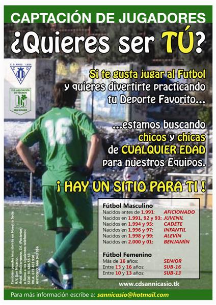 Para más información escríbenos un mail a sannicasio@hotmail.com, entra en nuestra web www.cdsannicasio.tk.