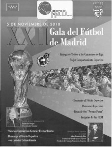 La 22ª edición de la Gala del Fútbol de Madrid que se celebrará el viernes 5 de noviembre homenajeará, entre otros, a todos aquellos protagonistas que afiliados a la Federación de Fútbol de Madrid participaron en el logro del Mundial de Sudáfrica.