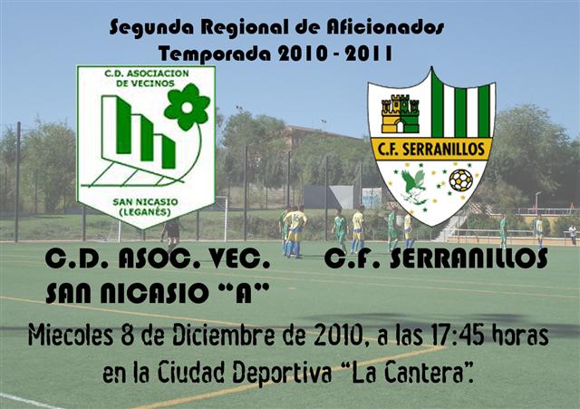 C.D. Asoc. Vec. San Nicasio «A»- C.F. Serranillos, el partido correspondiente a la 9ª jornada de liga que se suspendió por la coincidencia de colores del C.F. Serranillos con el C.D. Asoc. Vec. San Nicasio «A», el partido finalmente se disputará el próximo día 8 de Diciembre (Miércoles), según ordenó el Comité de Competición de la Federación de Fútbol de Madrid, la hora de disputa del encuentro serán las 17:45 horas en la Ciudad Deportiva «La Cantera» de Leganés.