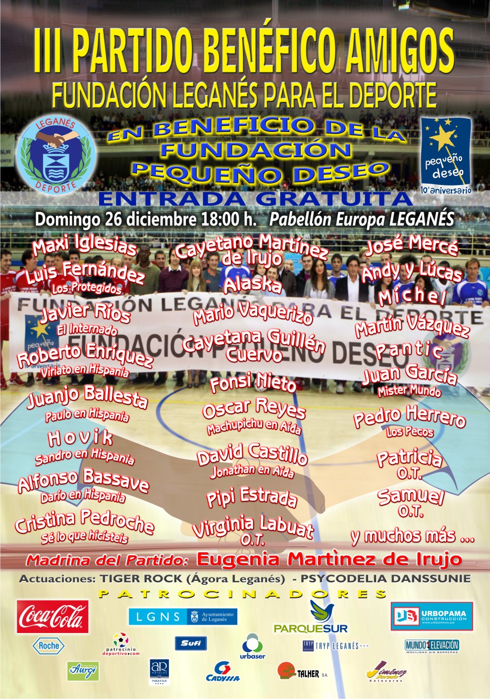 Estos son los dos objetivos de la Fundación al organizar este partido que pone el punto final a las actividades de la Fundación en 2010. Además, que la ciudad de Leganés actúe como anfitrión de los rostros más populares de la actualidad que, desinteresadamente, colaboran con esta preciosa causa.