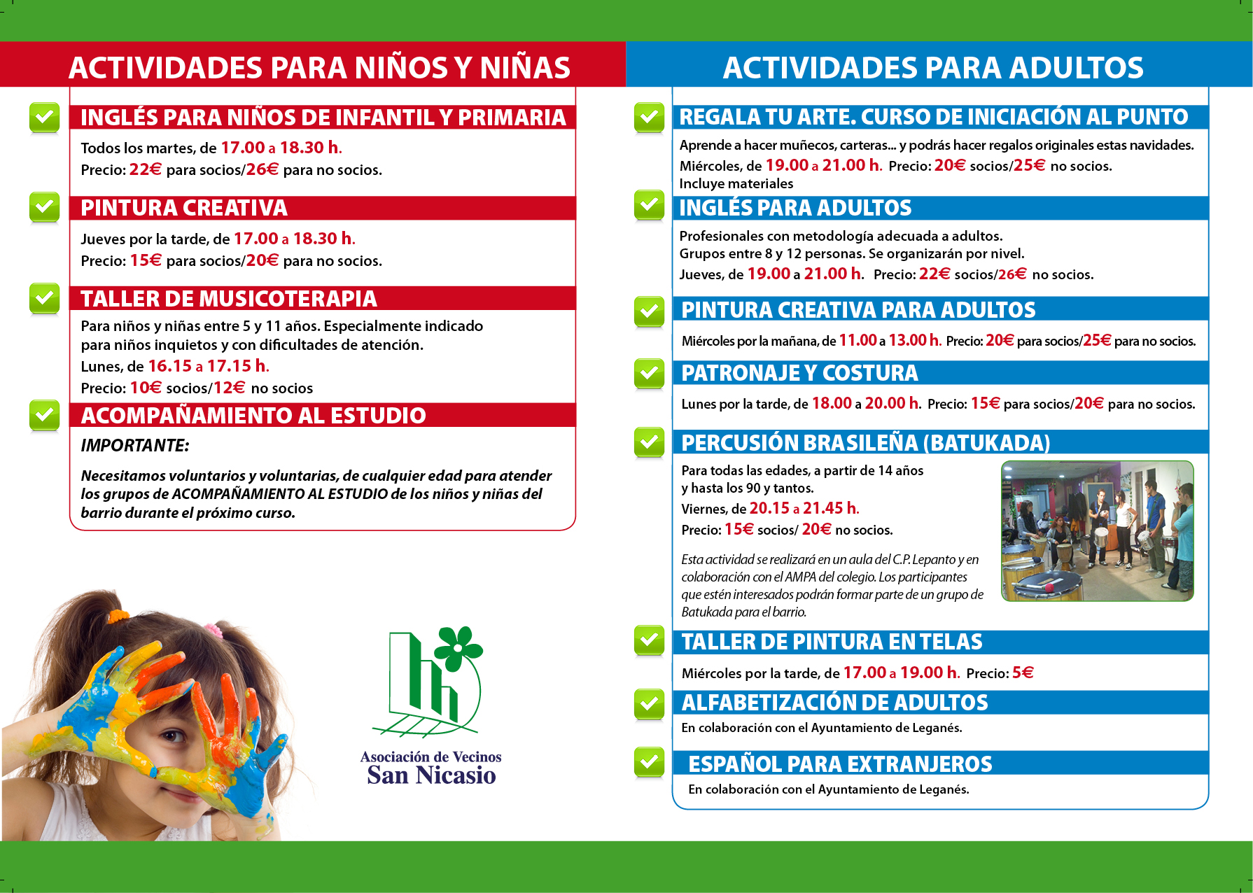 A continuación se adjunta información de los programas de actividades y cursos para este periodo 2014 / 2015 que propone la ASOCIACIÓN DE VECINOS DE SAN NICASIO – LEGANÉS (MADRID) para todos los vecinos del Barrio y cuaqluier persona que este interesada en participar.