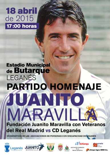 Madrid, 6 de abril. La Fundación Juanito Maravilla y el ayuntamiento de Leganés (Madrid) han llegado a un acuerdo para la celebración de un partido homenaje al exjugador del Real Madrid Juan Gómez Juanito, cuyos beneficios, principalmente, irán destinados a proyectos para la rehabilitación e inserción social de personas con discapacidad intelectual. El partido se disputará el próximo 18 de abril en el estadio de Butarque y enfrentará a un equipo integrado por futbolistas de la Fundación Juanito Maravilla y veteranos del Real Madrid contra otro de veteranos del Leganés. Durante el encuentro se sorteará entre los asistentes una camiseta firmada por Cristiano Ronaldo. La Asociación de Empresarios de Leganés ha realizará una dotación económica que se destinará a financiar proyectos de personas con discapacidad que se realicen en la ciudad de Leganés.