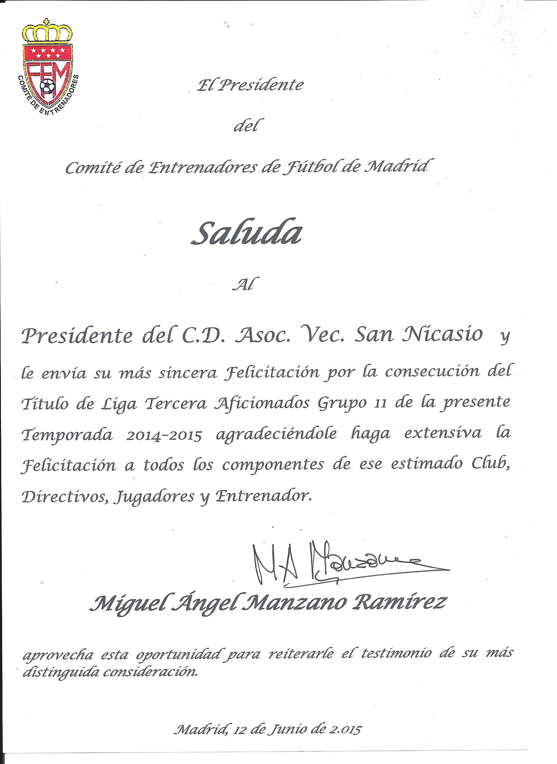 Felicitación Comité de Entrenadores Campeón Tercera Regional CD AV San Nicasio