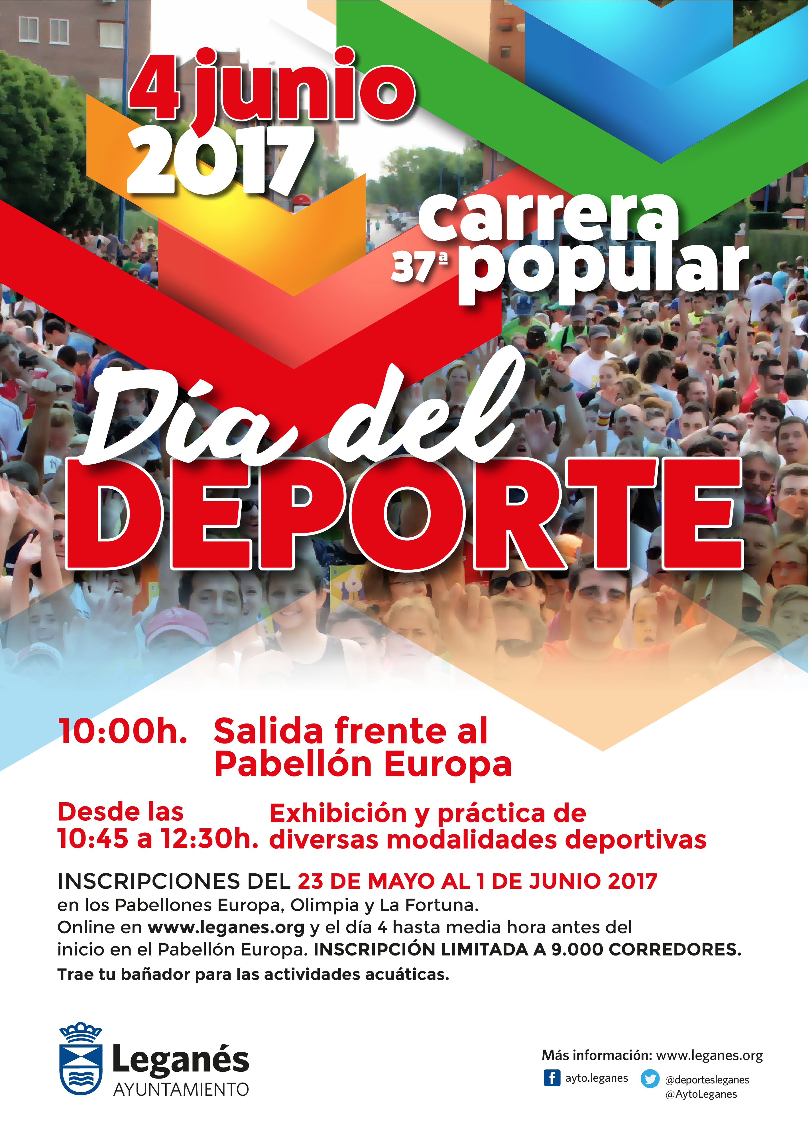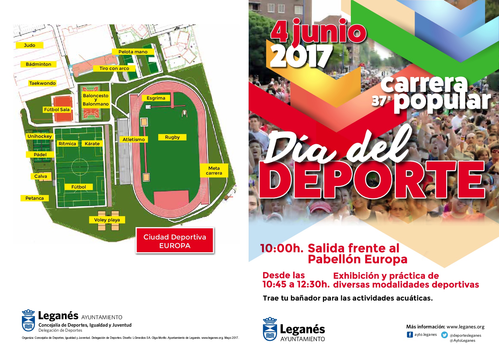 El próximo Domingo 4 de Junio de 2017, la Delegación de Deportes del Ayuntamiento de Leganés. celebra la 37ª Carrera Popular de Leganés, y también celebra el Día del Deporte de Leganés 2017.