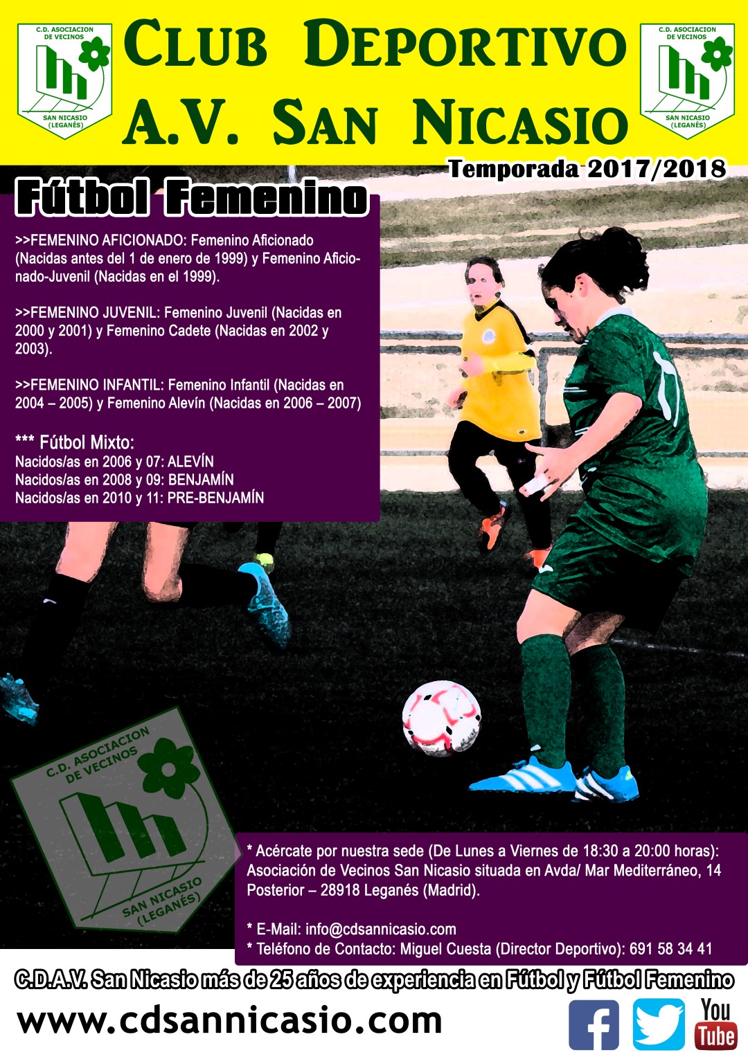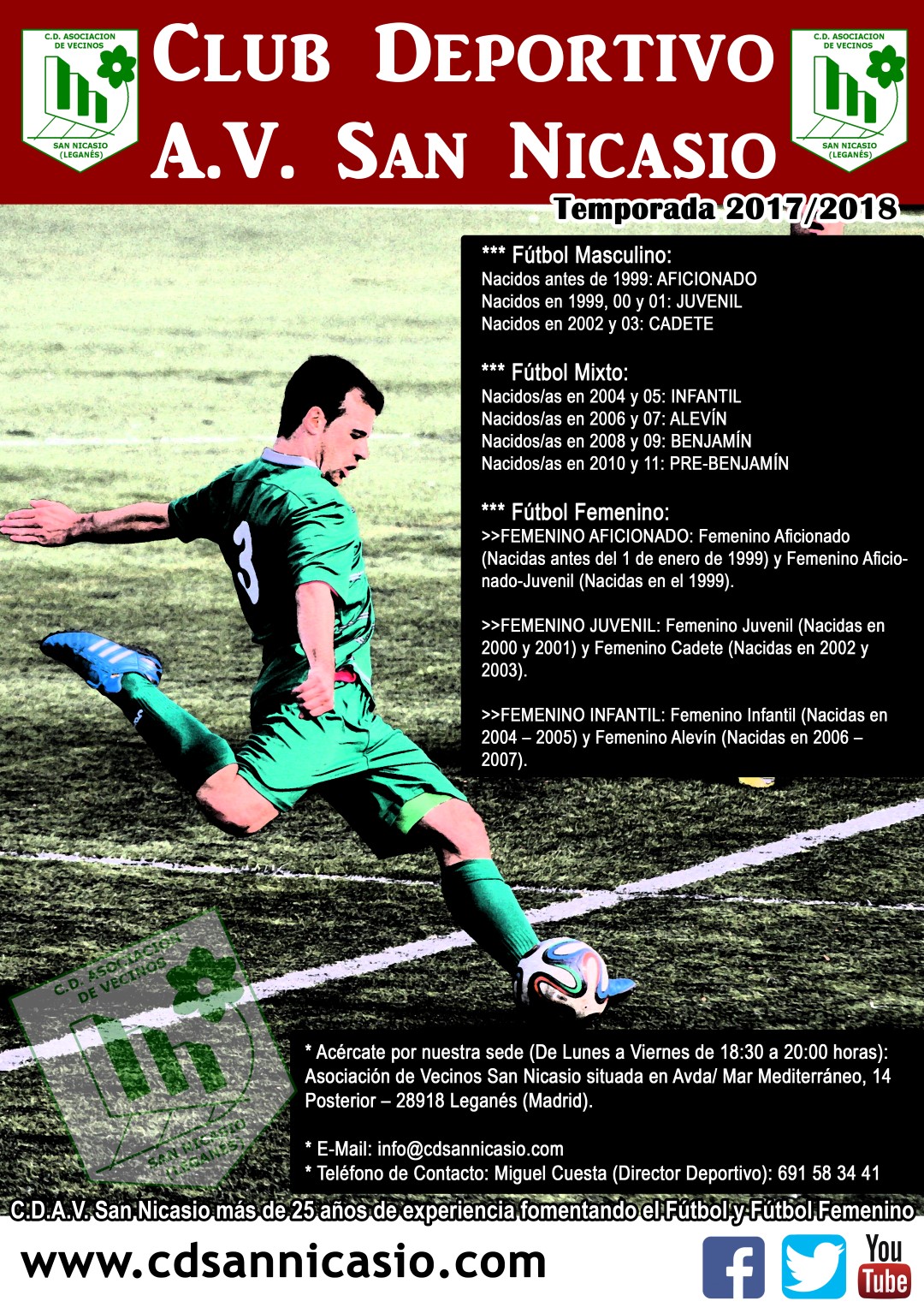 Para la Temporada 2017 – 2018, el C.D. Asoc. Vec. San Nicasio continúa con la búsqueda de nuevos futbolistas para completar sus plantillas. Únete a nuestro club. Ya seas jugador de fútbol masculino o femenino, en nuestro club seguro que tienes sitio. Disfrutarás del mejor ambiente, entrenadores titulados y de material deportivo de gran calidad.