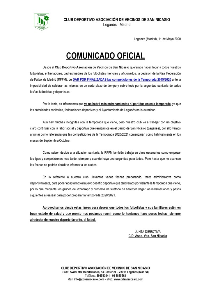 Desde el Club Deportivo Asociación de Vecinos de San Nicasio queremos hacer llegar a todos nuestros futbolistas, entrenadores, padres/madres de los futbolistas menores y aficionados, la decisión de la Real Federación de Fútbol de Madrid (RFFM), de DAR POR FINALIZADAS las competiciones de la Temporada 2019/2020 ante la imposibilidad de celebrar las mismas en un corto plazo de tiempo y sobre todo por la seguridad sanitaria de todos los/las futbolistas y deportistas.