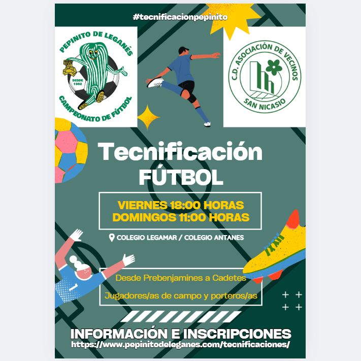 Con este acuerdo, nuestro objetivo es beneficiar a todos los jugadores de nuestro club que lo deseen, ofreciéndoles nuevas oportunidades de aprendizaje y crecimiento en su formación deportiva. Los detalles completos (horarios, campos, información técnica, precios, categorías, edades) de las jornada de tecnificación están en la siguiente página web: https://pepinitodeleganes.com/tecnificaciones/