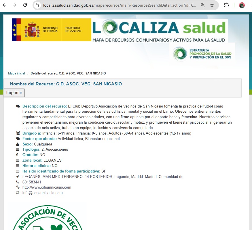 El CD AV San Nicasio forma parte del proyecto Localiza Salud, iniciativa promovida por el Ministerio de Sanidad, en colaboración con el Ayuntamiento de Leganés, cuyo objetivo es identificar y visibilizar recursos comunitarios que contribuyen a la promoción de la salud y el bienestar de la población.