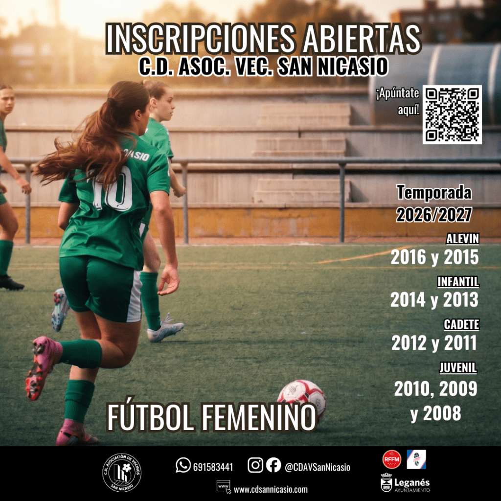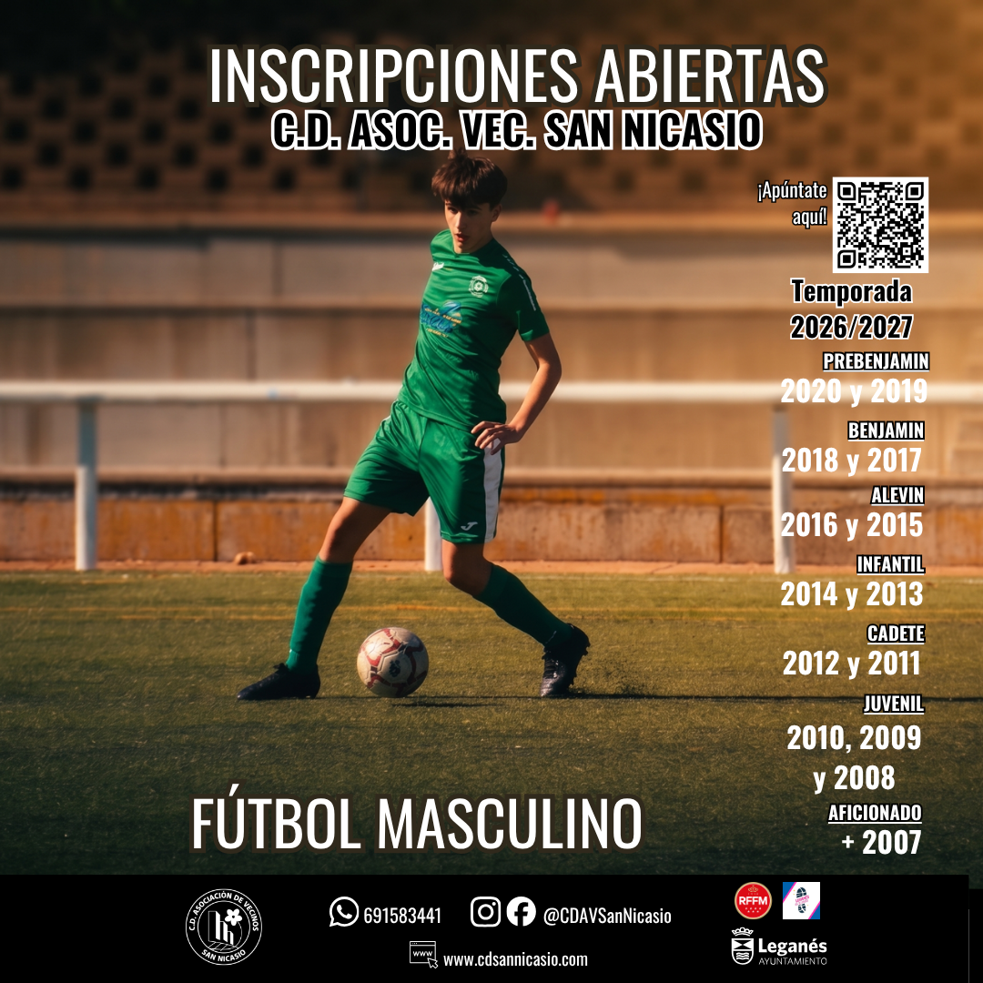 El C.D. Asociación de Vecinos San Nicasio, referente del fútbol base en Leganés, anuncia la apertura del plazo de inscripciones para la temporada 2026/2027, dirigida a niños, niñas y jóvenes que quieran formarse y disfrutar del fútbol en un entorno educativo y deportivo.