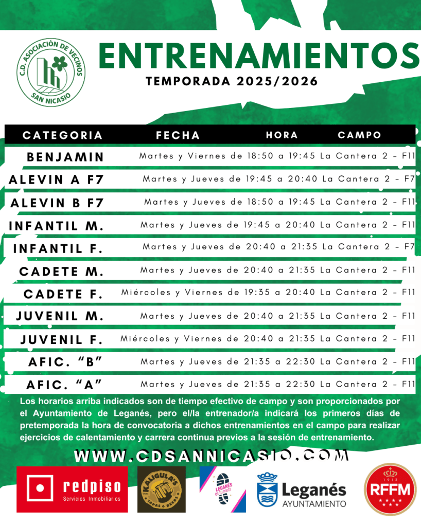 – BENJAMIN F7: Martes y Viernes de 18:50 a 19:45 – Campo 2 de Fútbol-11.
